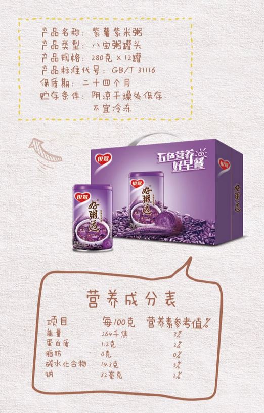 Yin Lu Hao Zhou Dao Purple Sweet Potato and Black Rice Porridge (280g) is a nutritious and delicious meal option that combines the rich flavors of purple sweet potato and black rice. This porridge offers a unique blend of taste and texture, making it a perfect choice for breakfast or a wholesome snack.